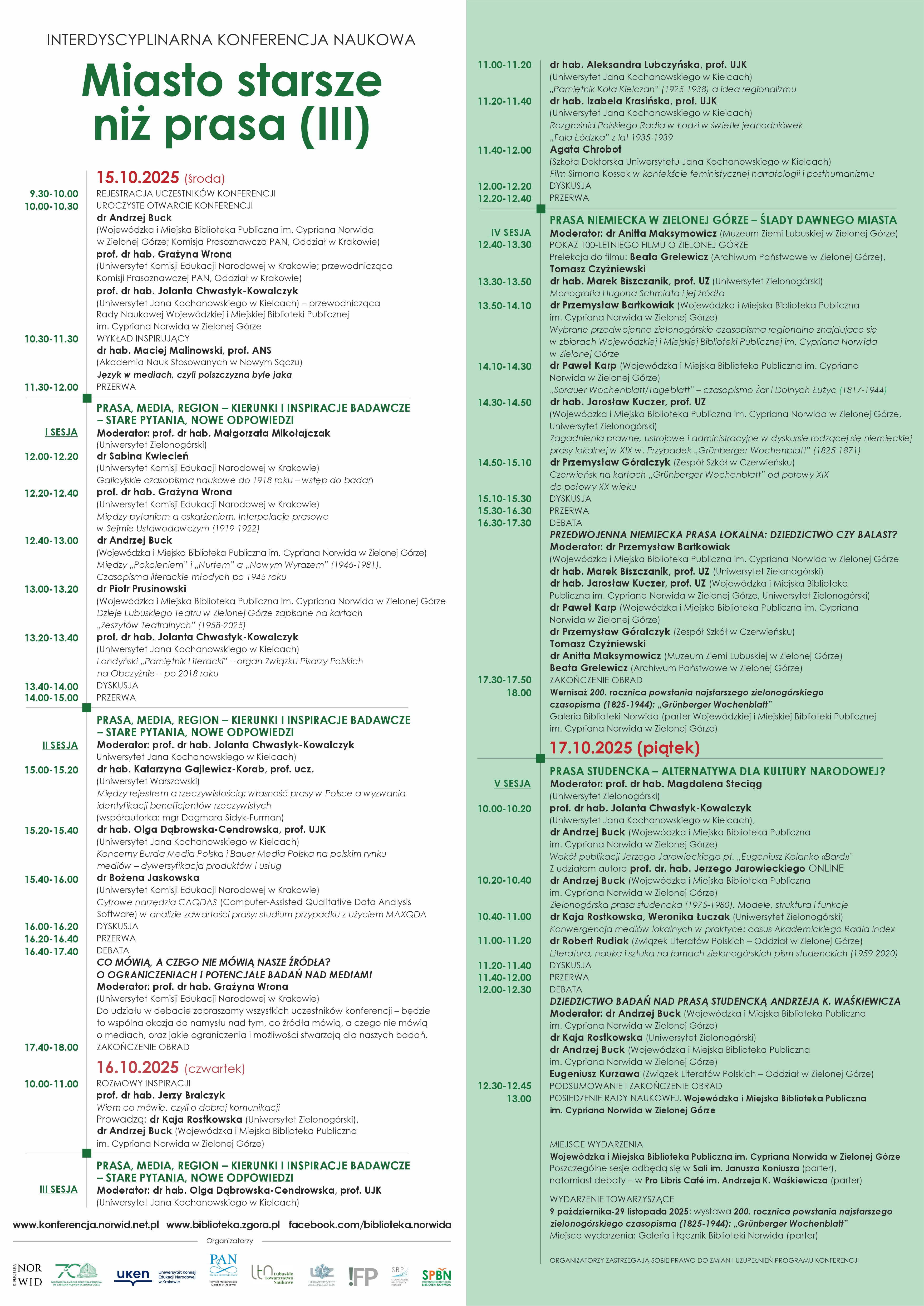 10.00-10.20 prof. dr hab. Jolanta Chwastyk-Kowalczyk (Uniwersytet Jana Kochanowskiego w Kielcach), dr Andrzej Buck (Wojewódzka i Miejska Biblioteka Publiczna im. Cypriana Norwida w Zielonej Górze)